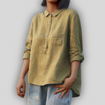 Klasyczna lniana bluzka, która emanuje dyskretną elegancją i codziennym komfortem. Posiada klasyczny kołnierzyk z guzikami z przodu oraz praktyczną kieszeń na piersi. Luźny krój i długie rękawy z możliwością podwinięcia sprawiają, że jest idealna na każdą porę dnia.