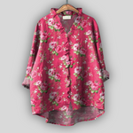 Romantyczna lniana bluzka w intensywnym różowym odcieniu z kwiatowym wzorem róż, która emanuje kobiecością i elegancją. Dekolt w kształcie V z dyskretnymi falbanami i luźny krój zapewniają komfort i przewiewne uczucie, podczas gdy asymetryczny dół z dłuższym tyłem dodaje nowoczesnego charakteru każdej stylizacji.