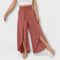 Oferując płynny design i rozcięcia przypominające otulającą spódnicę, te spodnie są idealne dla tych, którzy szukają wolności, świeżości i stylu w jednym. Lekka tkanina podąża za ruchami ciała z elegancją, podczas gdy wysoki stan podkreśla sylwetkę. Idealny element na gorące dni i swobodne kombinacje z nutą wyrafinowania.