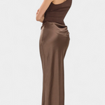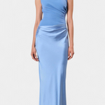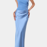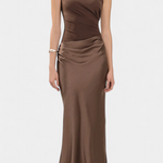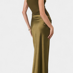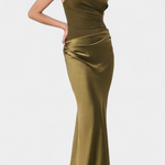 Zaprojektowana, aby podkreślić wieczną elegancję, ta długa plisowana sukienka łączy w sobie złożoność i obecność w każdym ruchu. Jej asymetryczne wycięcie na jedno ramię dodaje nowoczesnego i wyrafinowanego akcentu, podczas gdy delikatne marszczenia opadają z lekkością, formując imponującą i kobiecą sylwetkę. Wizja stworzona na chwile, które wymagają rozpoznawalności i pewności siebie.