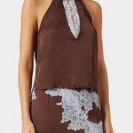 Wyszukana propozycja łącząca zmysłowość i nowoczesność. Drogocenny zestaw łączy dopasowany top i odpowiadającą spódnicę, obie podkreślone kontrastowymi koronkowymi panelami, które dodają tekstury i kobiecości. Równowaga między tonami tworzy wizualną głębię, podczas gdy przylegający sylwetka kształtuje figurę z elegancją. Uniwersalny wybór, który dostosowuje się zarówno do dnia, jak i nocy z kuszącym wyglądem.
