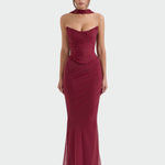 Elegancka i wyróżniająca się sukienka bez ramiączek z dopasowanym krojem, który podkreśla sylwetkę. Drapowane detale przy dekolcie i wiązanie w stylu gorsetu w talii dodają kobiecości i luksusu, podczas gdy maksymalna długość oferuje ponadczasową wyrafinowanie. Idealna na wieczorne wyjścia i uroczyste okazje.