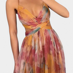 Romantyczna, lekka i o naturalnej obecności. Sukienka Magdalena zachwyca swoim wyrazistym kolorowym wzorem i płynącą sylwetką, podczas gdy dekolt w kształcie V delikatnie podkreśla i formuje. Idealna na wesela, specjalne uroczystości lub po prostu, aby czuć się olśniewająco i elegancko w każdej chwili.