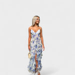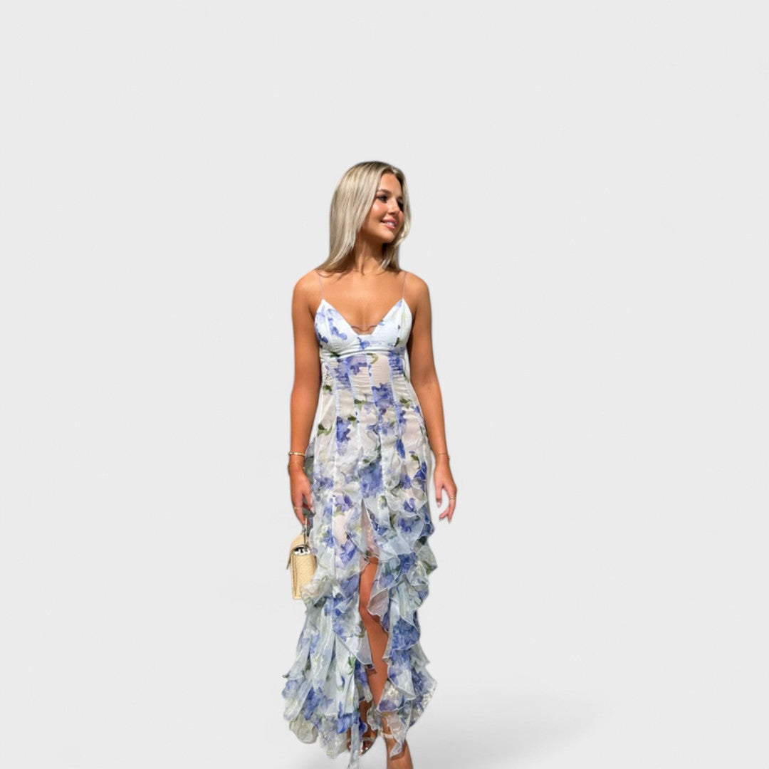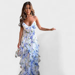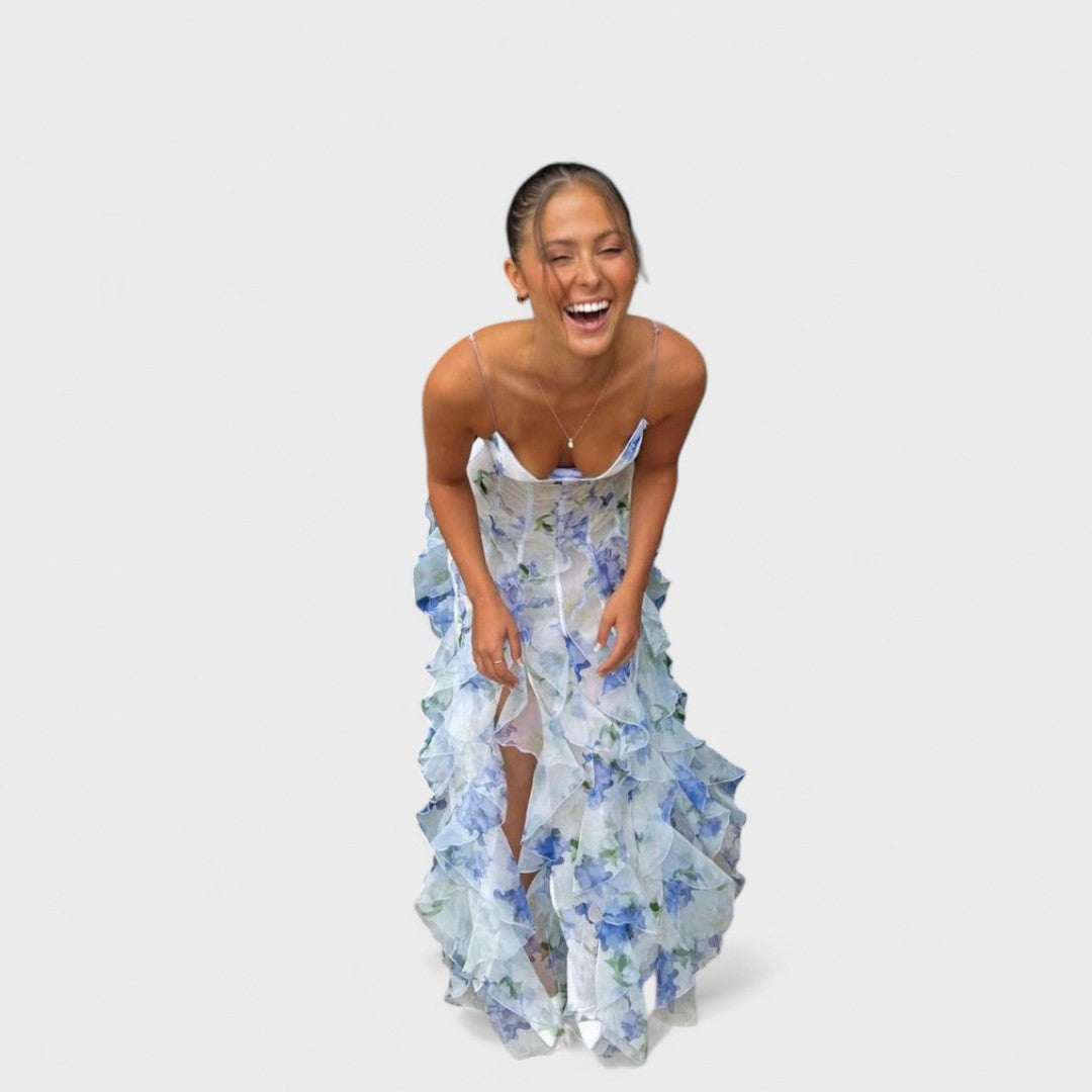 Długa kolorowa sukienka z falbanami dla perfekcyjnego romantycznego wyglądu