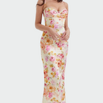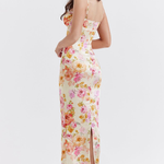 Imponująca maxi sukienka w kwiatowy wzór, która emanuje kobiecością i elegancją. Jej dopasowany krój podkreśla sylwetkę, podczas gdy dekolt z cienkimi ramiączkami nadaje wrażenie delikatnej atrakcyjności. Element, który łączy romantyzm i luksus, idealny na specjalne okazje.