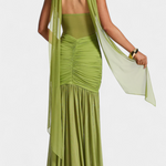 Elegancka zmysłowość w sylwetce, która płynie z zamiarem. Sukienka Milica wyróżnia się swoją ultra miękką teksturą z mlecznego jedwabiu i delikatnym blaskiem, który pieści każdą krzywiznę. Jej głęboki dekolt w kształcie litery V i niski tył tworzą wydłużoną linię, podczas gdy strategicznie uformowane detale subtelnie modelują. Wysoki rozcięcie dodaje akcentu wyrafinowanej odwagi.