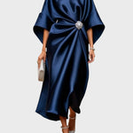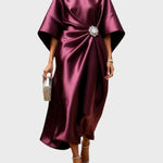 Emanująca luksusem i wieczną elegancją, ta sukienka satynowa jest uosobieniem finezji. Jej unikalny krój w połączeniu z dekoracyjną klamrą podkreśla sylwetkę dyskretnym blaskiem.