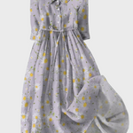 Ta urocza długa sukienka w delikatnym fioletowym kolorze jest idealnym wyborem na świeży i wiosenny wygląd. Jej dyskretna kolorystyka z białymi i żółtymi kwiatami wprowadza przytulną i radosną atmosferę, a pasek w talii zapewnia idealne dopasowanie.