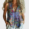 Wyraź swoją artystyczną stronę stylu dzięki temu bezrękawnikowi w fioletowym odcieniu, zdobionemu abstrakcyjnymi motywami geometrycznymi w intensywnych kolorach. Projekt z guzikami oferuje praktyczność i elegancję, podczas gdy luźny krój zapewnia komfort w codziennych i letnich stylizacjach.