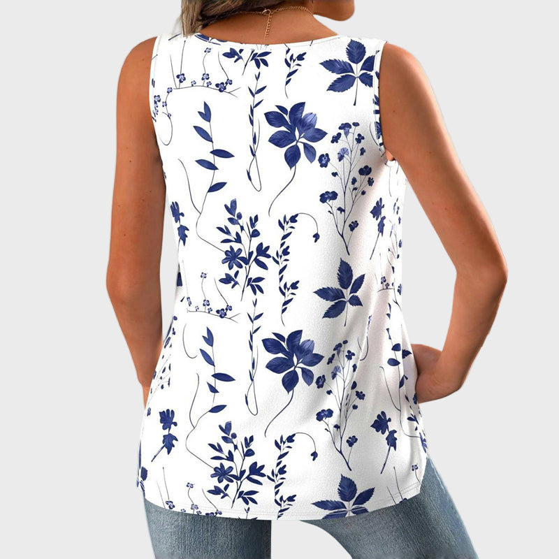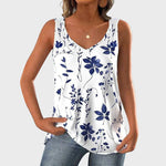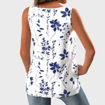 Ciesz się świeżością lata z tym bezrękawnikowym t-shirtem na białej bazie, ozdobionym niebieskimi motywami kwiatowymi. Jego luźny krój zapewnia komfort i swobodę ruchów, podczas gdy dekolt w kształcie litery V dodaje kobiecości i elegancji. Idealny do codziennych i letnich stylizacji.
