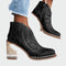 Nowoczesne damskie botki w stylu western, z unikalnymi haftowanymi wzorami i dekoracyjnymi detalami na podeszwie. Drewniana klamra z przezroczystym elementem nadaje wyjątkowy charakter i elegancję, a wygodny krój sprawia, że te botki są idealne do stylowych stylizacji od rana do wieczora. Wyrazisty model, który łączy komfort z dynamicznym wyglądem.