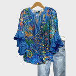 Wyraź swój artystyczny styl dzięki tej bluzie w intensywnym niebieskim kolorze, ozdobionej kolorowymi abstrakcyjnymi wzorami i detalami przypominającymi malarskie płótno. Rękawy z falbanami dodają elegancji i ruchu, podczas gdy delikatny krój sprawia, że ta bluza jest idealna na codzienne i specjalne okazje.